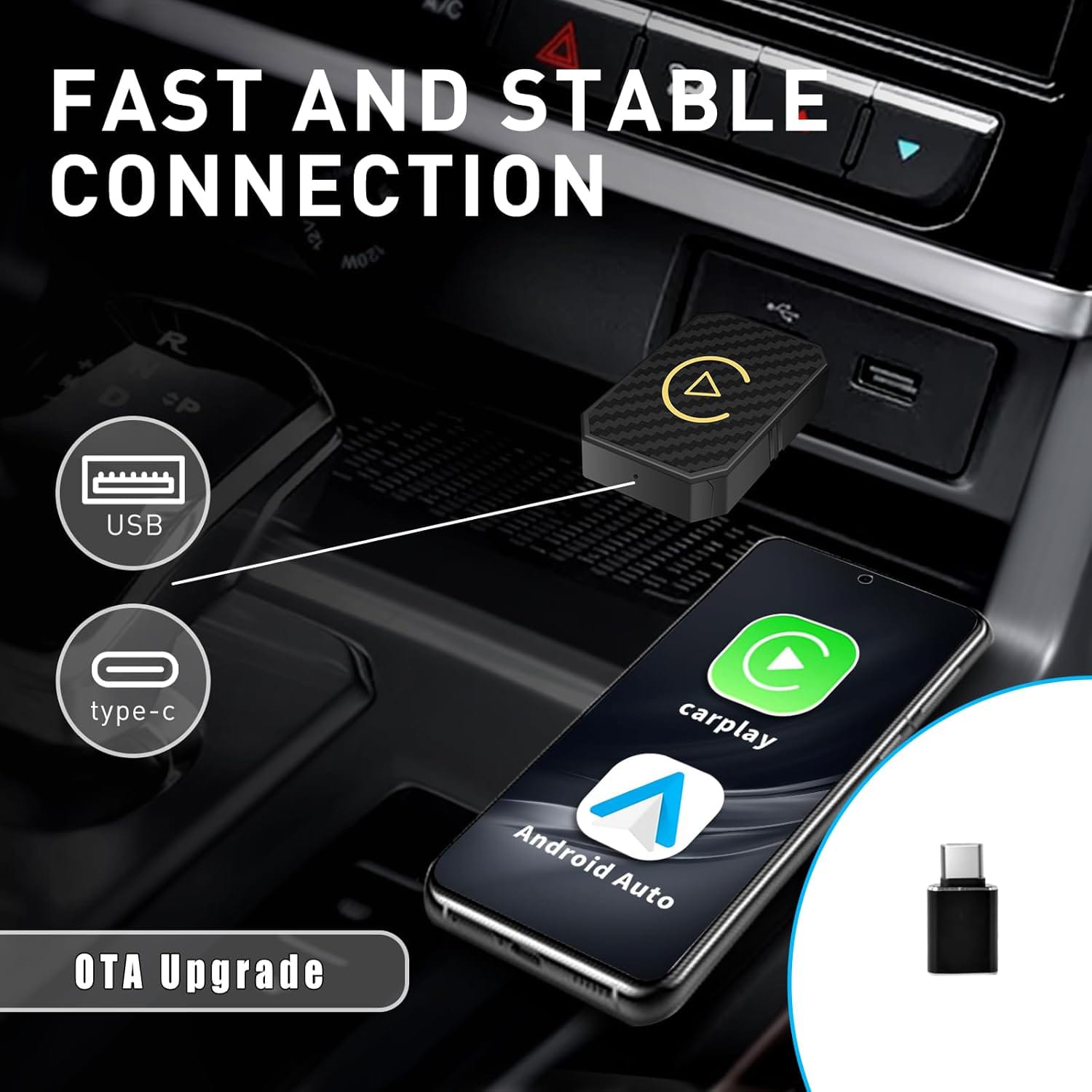 Android Car Wireless Stable Connection, Wireless Android Car Adapter Easy Setup in 3 Steps, Android Car Adapter for Apple Carplay, USB C/A,