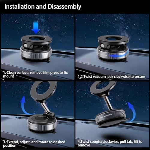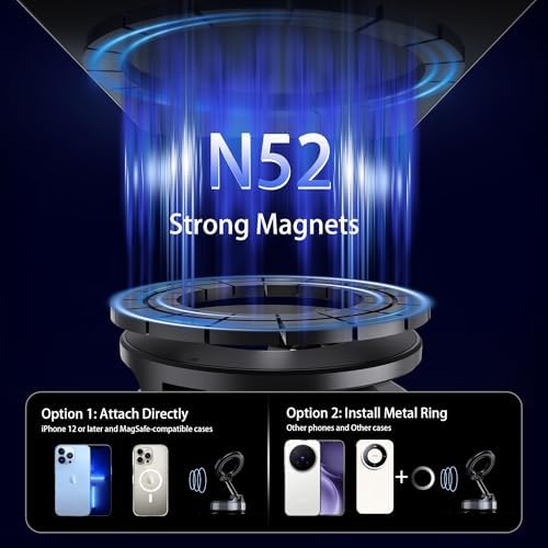 About this item 【Innovative Suction Cup Base with Unmatched Stability】Upgraded suction cup phone mount creates a vacuum seal that grips firmly on windshields, dashboards, or any smooth surface – even in extreme temperatures.It stays rock-solid through bumpy roads yet removes cleanly without residue.(Includes a free dashboard pad specifically designed for textured surfaces – simply attach your suction cup phone mount to this adhesive platform for rock-solid positioning on grainy dashboards). 【Super Stronger Magnetic MagSafe Car Mount】This powerful magnetic phone holder for car features the latest top-grade (N52) neodymium magnets with a dual-ring magnetic array, delivering shake-proof security and long-lasting anti-demagnetization performance, boasts magnetic strength 300% stronger than standard magnets, providing up to 96LBS of magnetic force, It can firmly supports your device while allowing you to drive without distraction. it easily and securely holds your phone through bumps, sharp turns or even sudden stops, no worrying of dropping your phone 【Full 360° View Adjustment 】 This car phone holder features a 360° rotating rod and 180° dual-axis folding metal arms, allowing easy angle adjustments to suit your needs. Whether in the car or at the office, switch between portrait and landscape modes effortlessly. Quickly pick and place with one hand, free your hands and make calls and GPS navigation more convenient official Magsafe cases and other magnetic phone cases and can be fixed directly to these phones without the need to affix metal plates. Other smartphones that do not support MagSafe (Must be used with metal rings!)- Metal rings NOT INCLUDED 【Safe Driving View】Mini-size, not taking up space, it is placed in the dashboard without blocking the view at all, and does not need to look down at the device to ensure your safe driving. Cell Phone Car Mount is suitable for most cars, pickups, SUV, taxi; It is the best assistant for Uber and Lyft drivers 【Multi Scenes, Not Only for Car】Not just for your vehicle, this magnetic phone mount also adheres to various smooth surfaces like mirrors, windows, or screens, making it perfect for use in multiple scenarios—driving, fitness activities, cooking, or even the shower. It’s the ideal accessory for any situation where hands-free use is needed ❤️️Doing Responsibly and Sustainably❤️ Estbuc phone holders for your car comes with 18 months warranty, and friendly customer service.If you have any questions about the product, just contact us. all while We operates sustainably, to high environmental and social standards. And continue to embed sustainability ever deeper in the way we do business